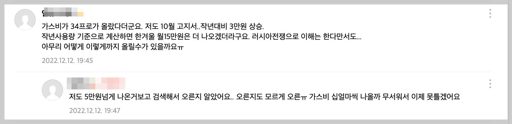 2022년 12월에 한 네티즌이 올린 글 이에요. 투룸 탑층 빌라에 살고 있는데, 빌라도 가스비가 엄청 올랐다고 해요. 한 겨울에도 보통 가스비가 2만원 나왔는데 이번 겨울에는 5만원이 넘게 나왔다고 하네요.